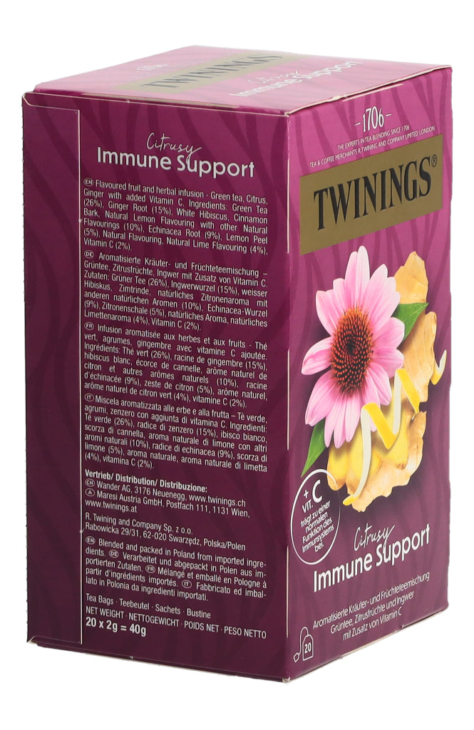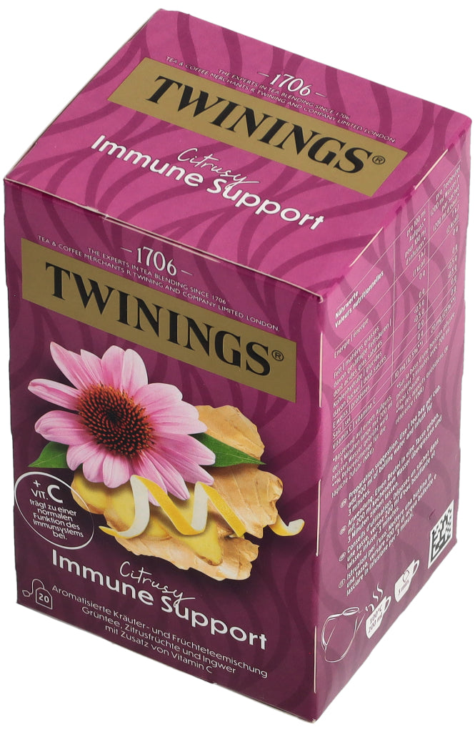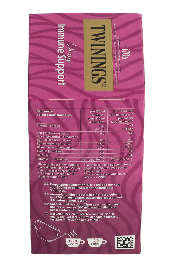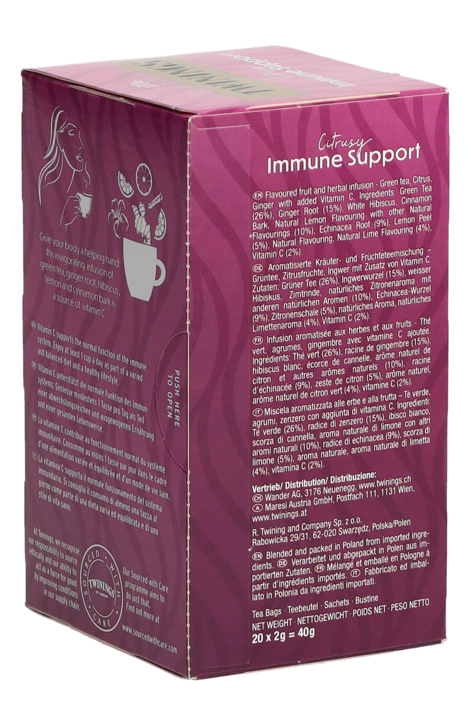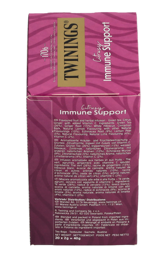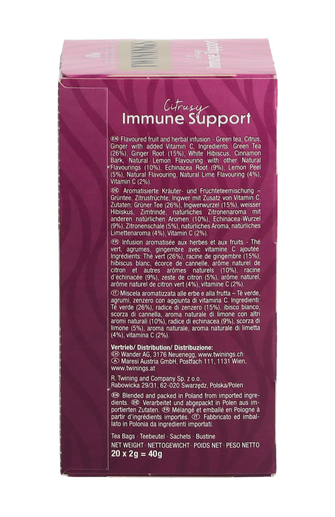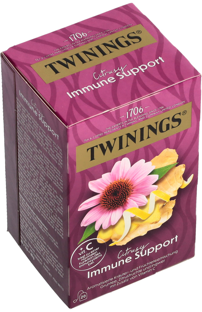 Zutaten: Grüner Tee (26%), Ingwerwurzel (15%), weisser Hibiskus, Zimtrinde, natürliches Zitronenaroma mit anderen natürlichen Aromen (10%), Echinacea-Wurzel (9%), Zitronenschale (5%), natürliches Aroma, natürliches Limettenaroma (4%), Vitamin C (2%)..