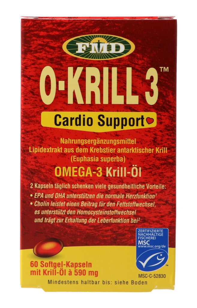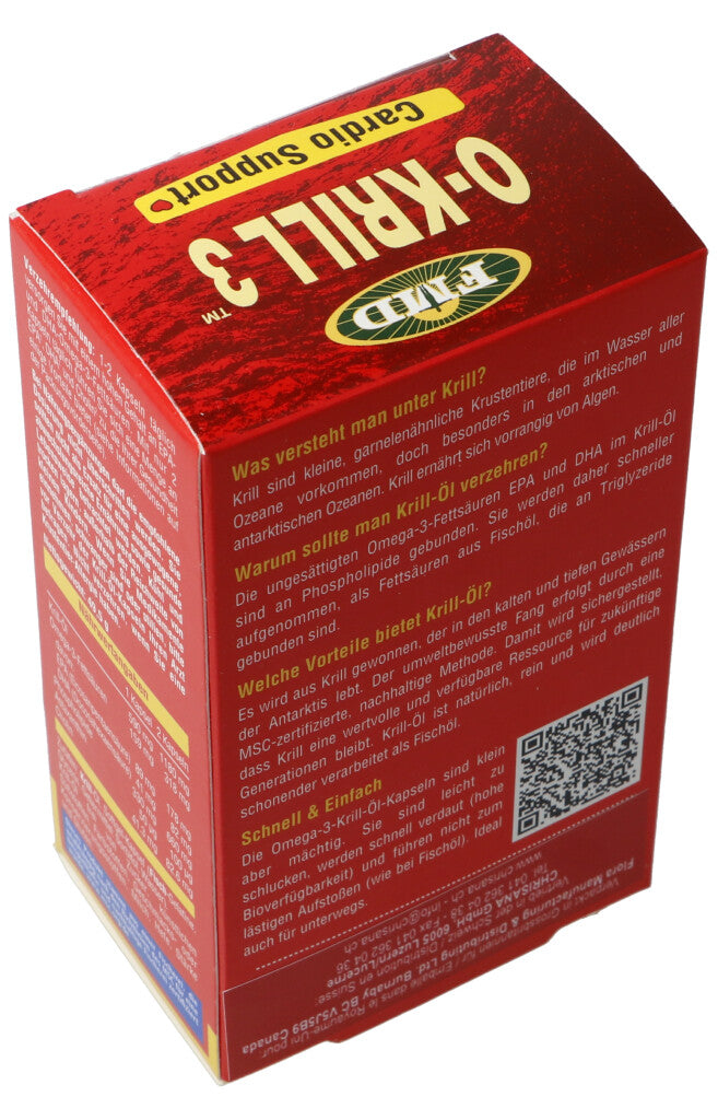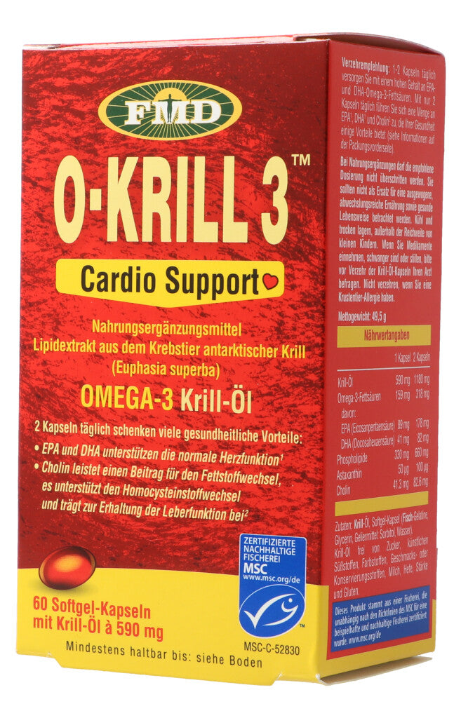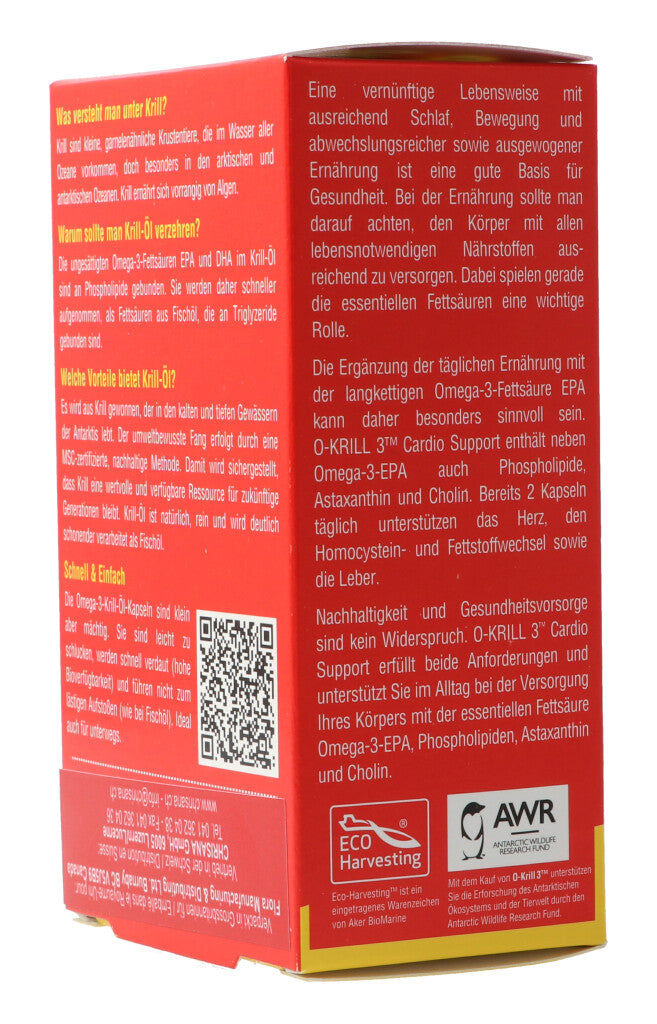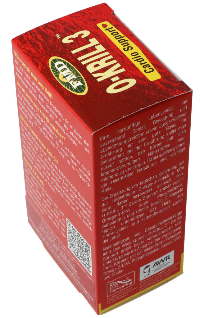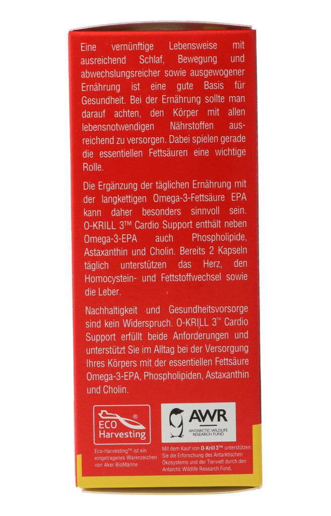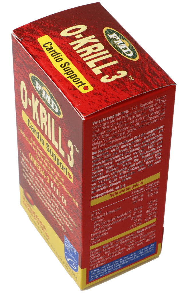 Die Ergänzung der täglichen Ernährung mit der langkettigen Omega-3-Fettsäure EPA kann daher besonders sinnvoll sein. O-KRILL 3 Cardio support enthält neben Omega-3-EPA auch Phospholipide, Astaxanthin und Cholin. Bereits 2 Kapseln täglich unterstützen das Herz, den Homocystein- und Fettstoffwechsel sowie die Leber.