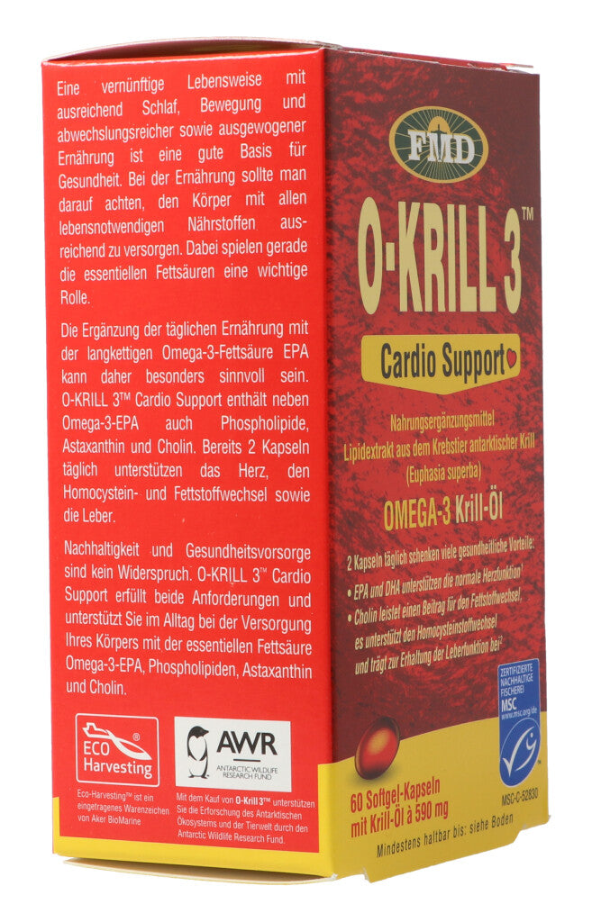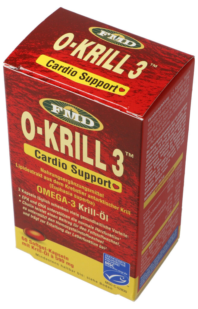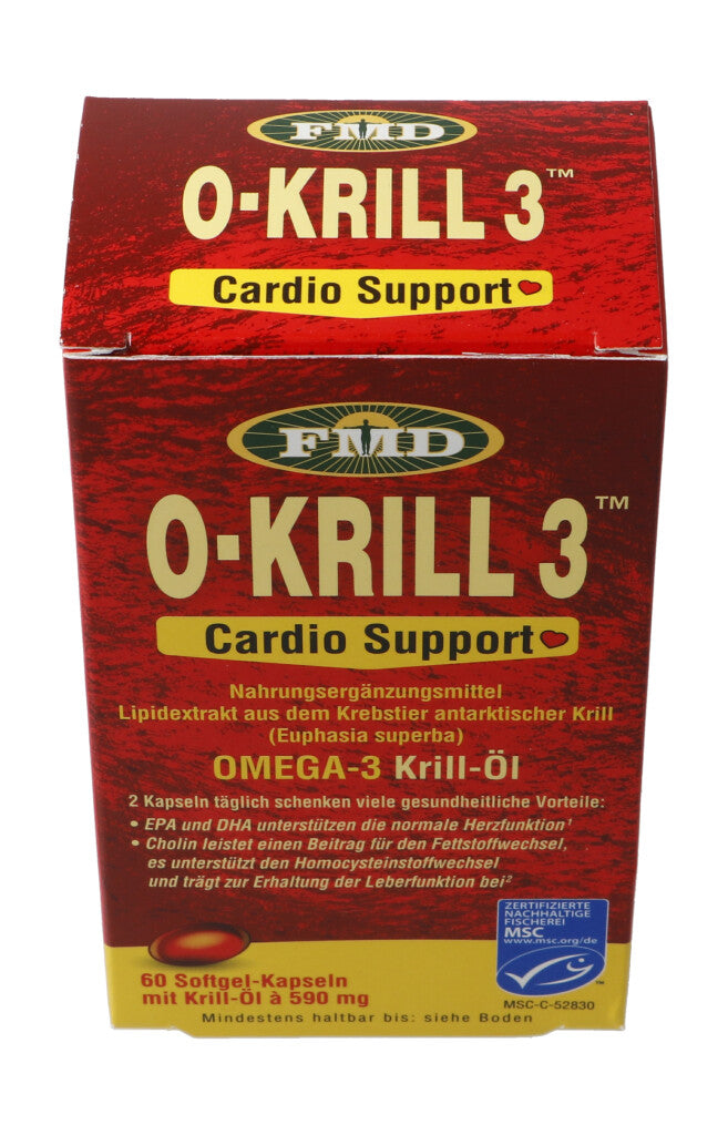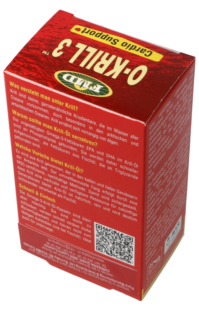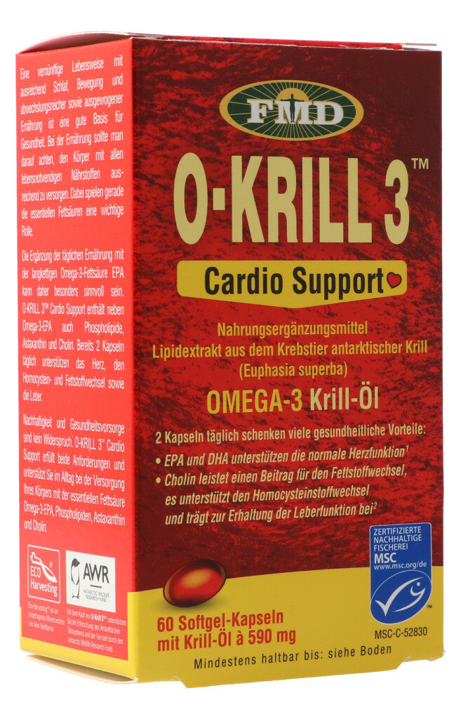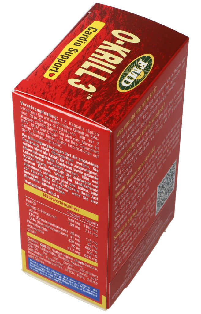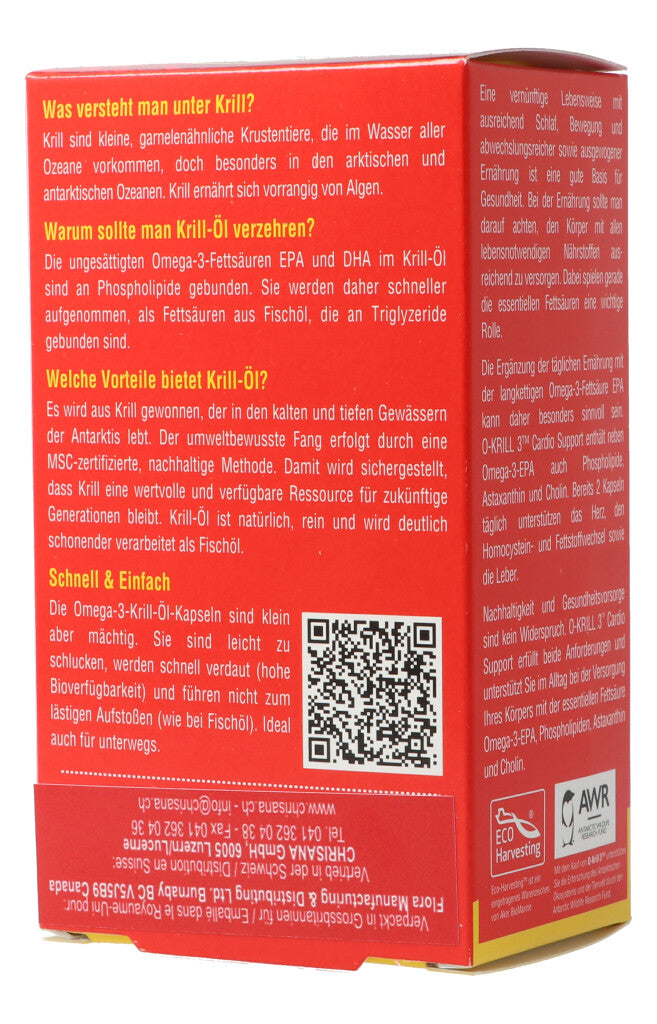 Die Ergänzung der täglichen Ernährung mit der langkettigen Omega-3-Fettsäure EPA kann daher besonders sinnvoll sein. O-KRILL 3 Cardio support enthält neben Omega-3-EPA auch Phospholipide, Astaxanthin und Cholin. Bereits 2 Kapseln täglich unterstützen das Herz, den Homocystein- und Fettstoffwechsel sowie die Leber.