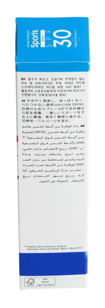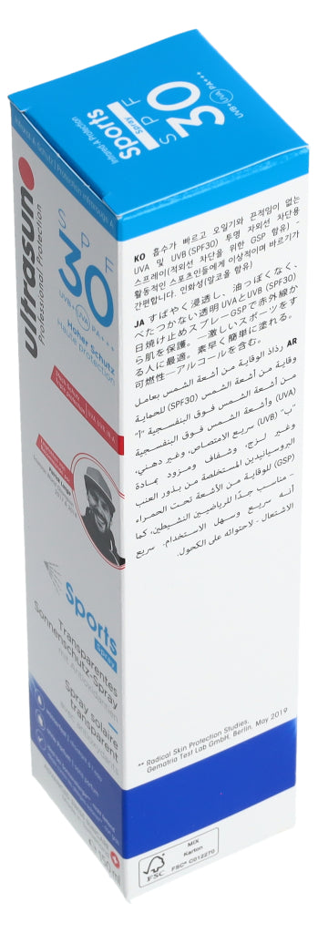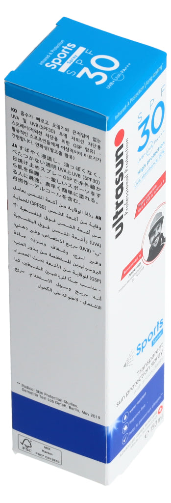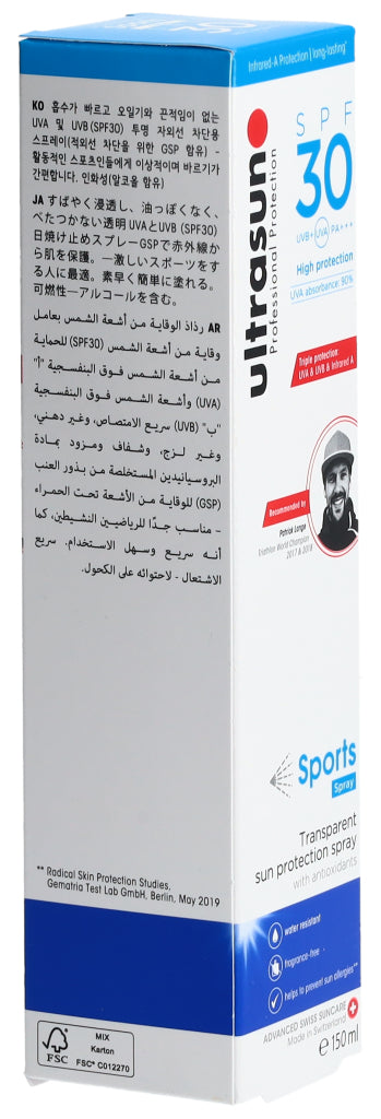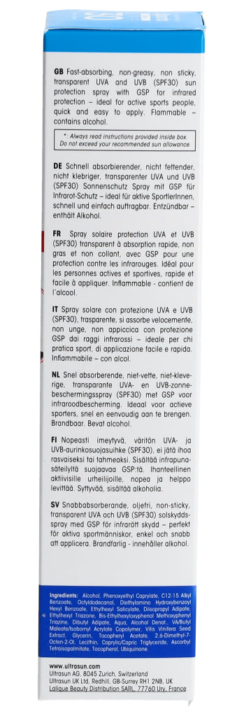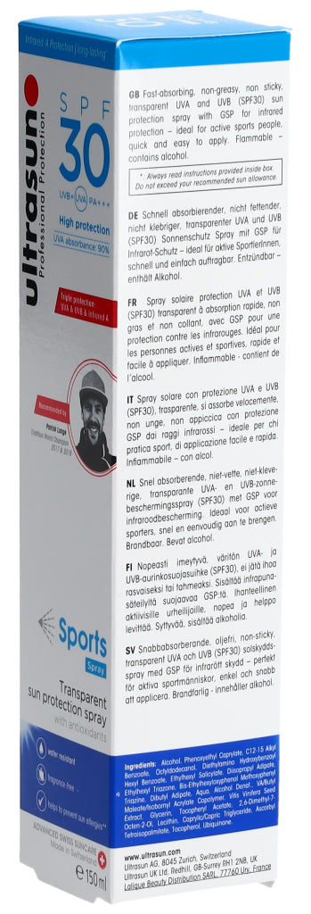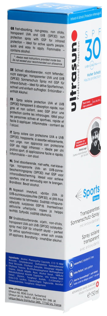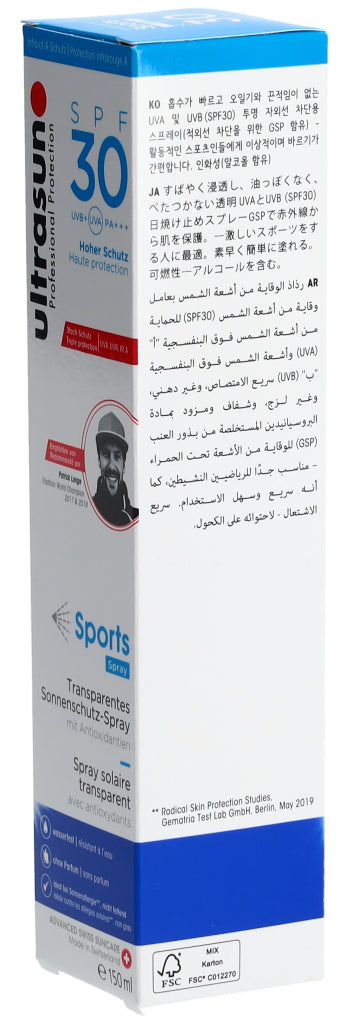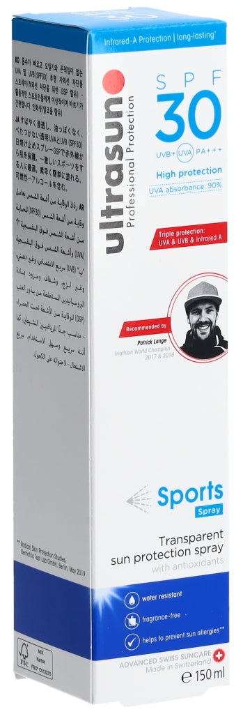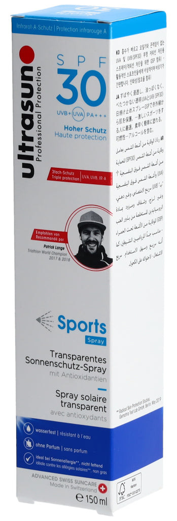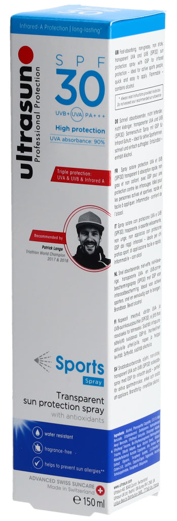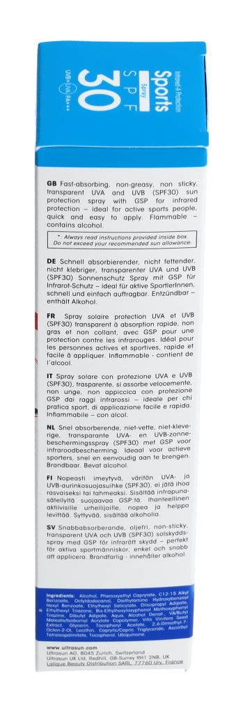 Das schnellabsorbierende Ultrasun Sports Spray ist perfekt SportlerInnen geeignet. Die nicht fettende Textur zieht schnell ein und kann auch bei einer Sonnenallergie problemlos aufgetragen werden. Der Schutz besteht aus der Kombination von InfraGuard, welches vor Infrarot Strahlung schützt und einem UVA sowie UVB Filter.