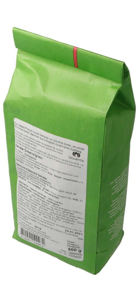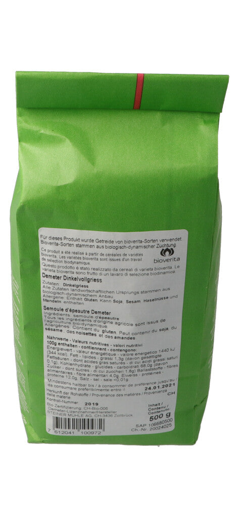 Dinkel-Vollgriess. Für dieses Produkt wurde Getreide von bioverita-Sorten verwendet. Bioverita-Sorten stammen aus biologisch-dynamischer Züchtung.