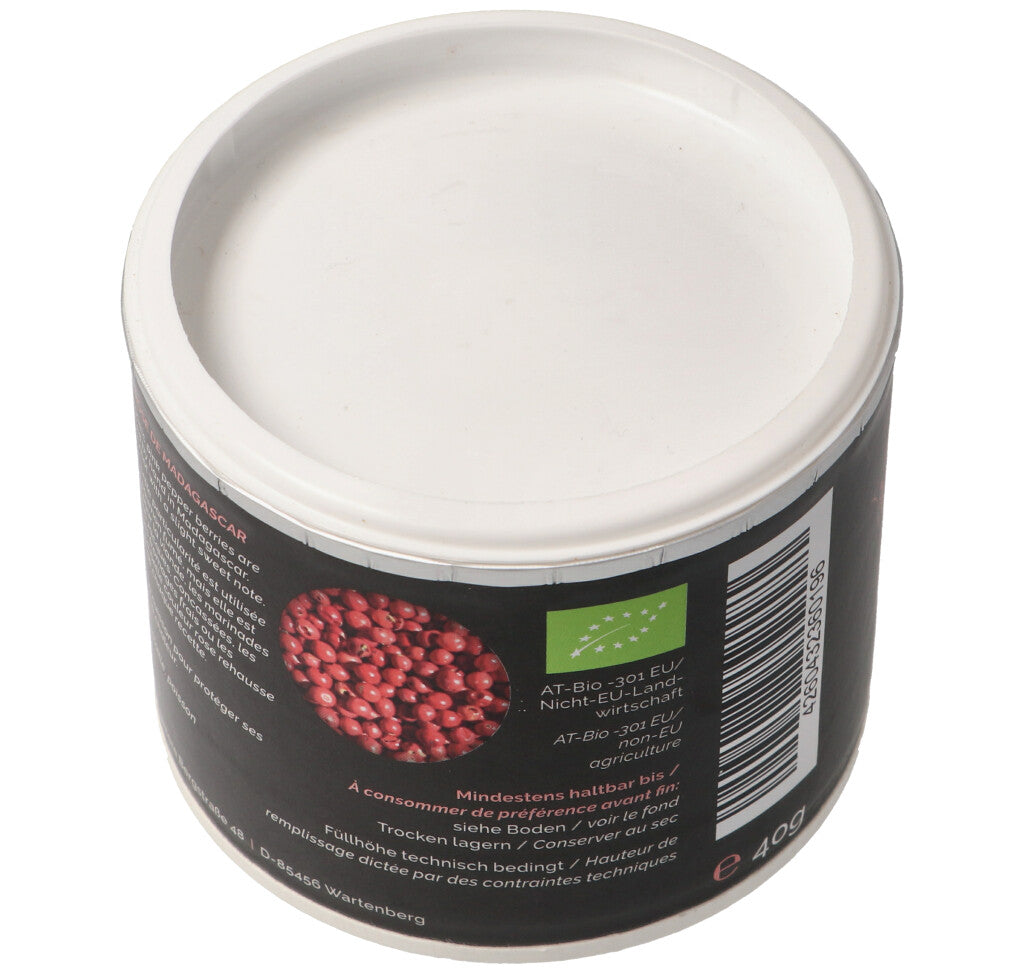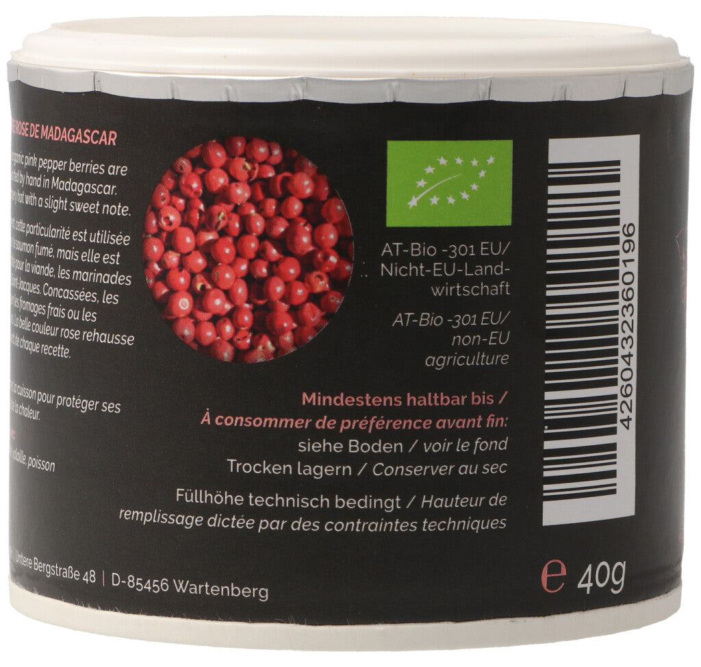 Diese exklusive Rosa Pfefferbeeren aus kontrolliert biologischem Anbau werden in Madagaskar per Hand geerntet und sortiert. Der Geschmack ist pfeffrig scharf mit einer leichten süssen Note.
