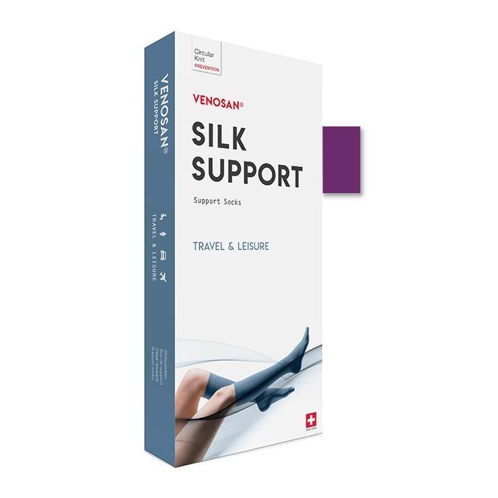 Die SILK SUPPORT Socks von VENOSAN entlasten Ihre müden und schweren Beine im Alltag und auf Reisen. Sie üben einen leichten Druck (15-20 mmHg) auf Ihre Beine aus und fördern die Durchblutung. Dadurch geniessen Sie eine effiziente Thromboseprophylaxe-Wirkung.Tragen Sie die SILK SUPPORT Stützstrümpfe bei der Arbeit, im Alltag oder auf langen Reisen, damit sich Ihre Beine leichter und entspannter anfühlen. Die Support Socks zeichnen sich durch eine stufenlos abnehmende Kompression aus.SILK SUPPORT Socks werden in der Schweiz hergestellt und bestehen aus 65% Polyamid, 20% Elastan und 15% Seide.