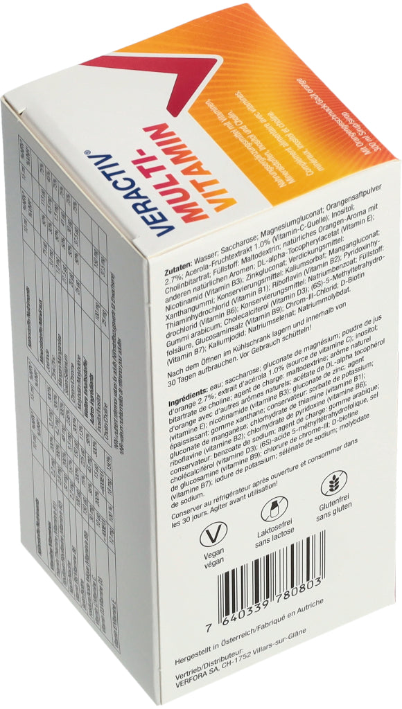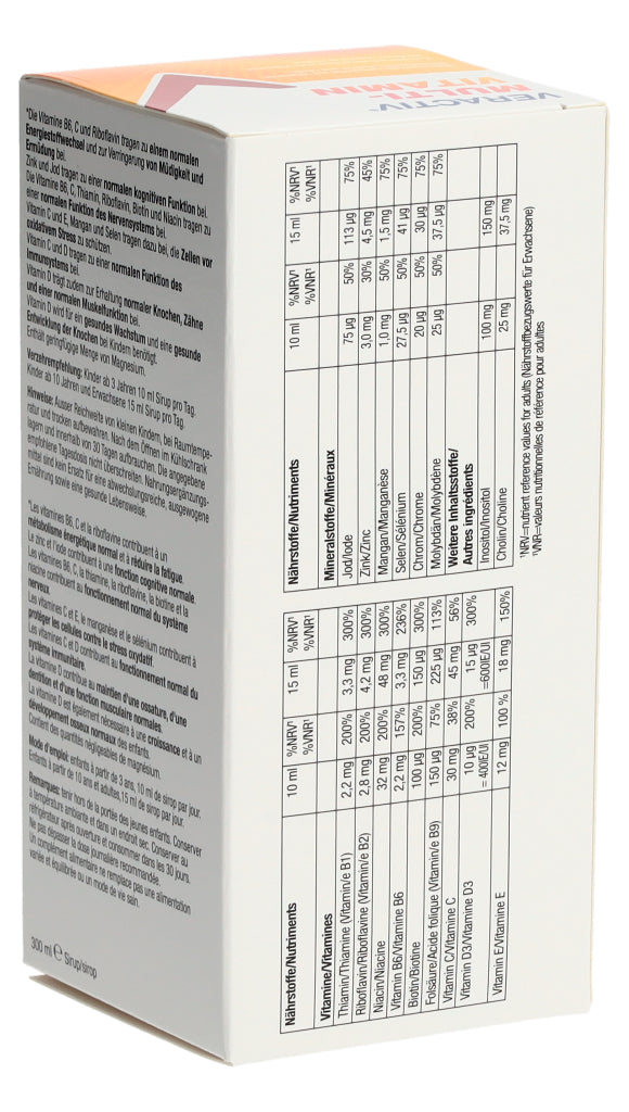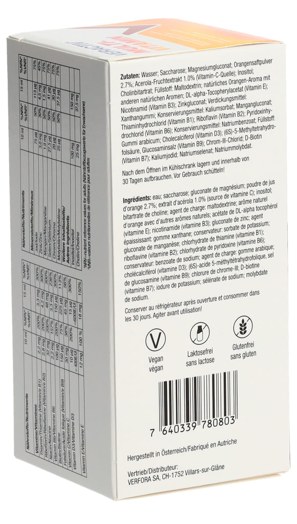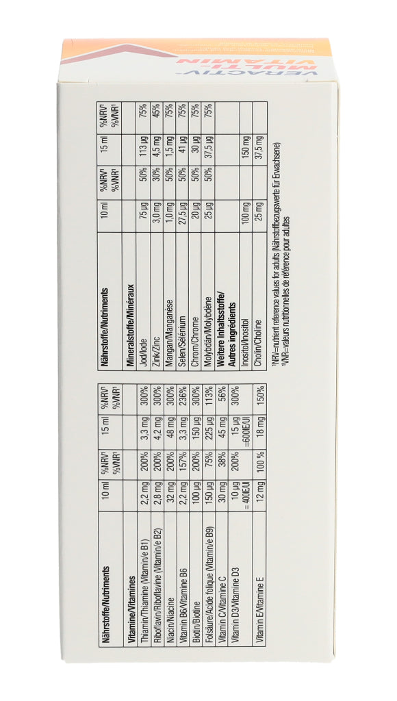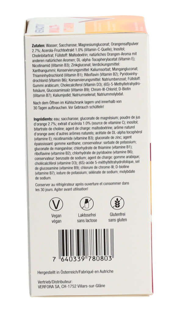 Wasser; Saccharose; Magnesiumgluconat; Orangenfruchtsaftpulver; Acerolafruchtextrakt; Inosit; Cholinbitartrat; Maltodextrin; Zinkgluconat; DL-alpha Tocopherylacetat; Aroma; Nicotinamid; Calcium-D-pantothenat; Mangangluconat; Pyridoxal-5-phosphat; Thiaminhydrochlorid; Riboflavin; Pteroylmonoglutaminsäure; Chrom(lll)-Chlorid; D-Biotin; Kaliumiodid; Natriumselenat; Natriummolybdat; Cyanocobalamin; Cholecalciferol; Verdickungsmittel: Xanthan; Konservierungsstoffe: Kaliumsorbat, Natriumbenzonat..
