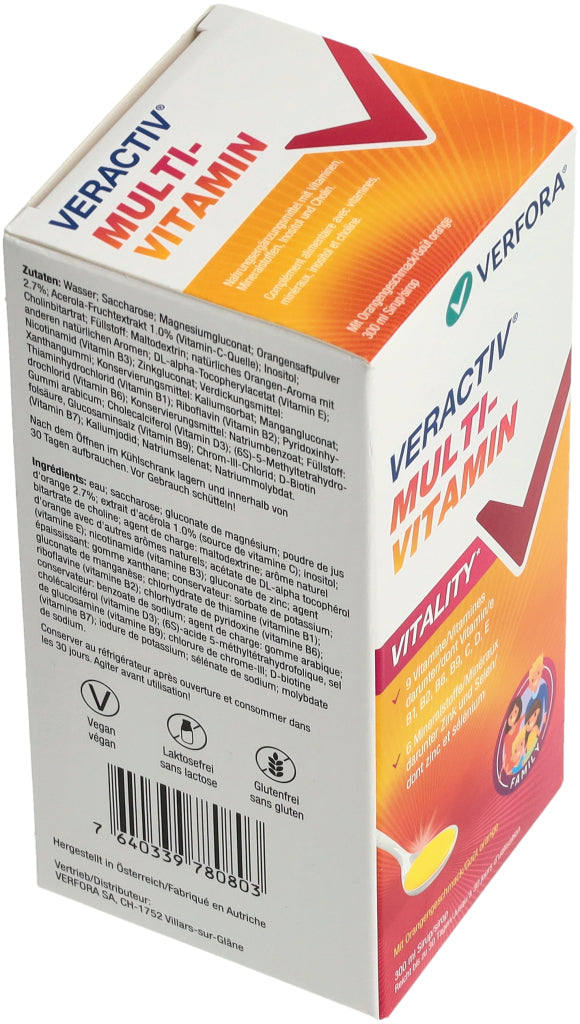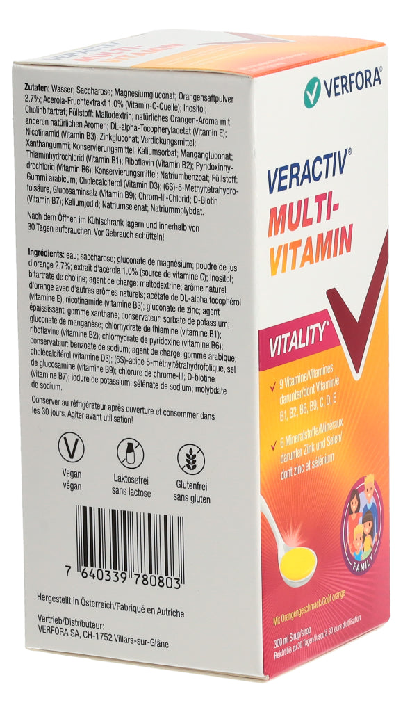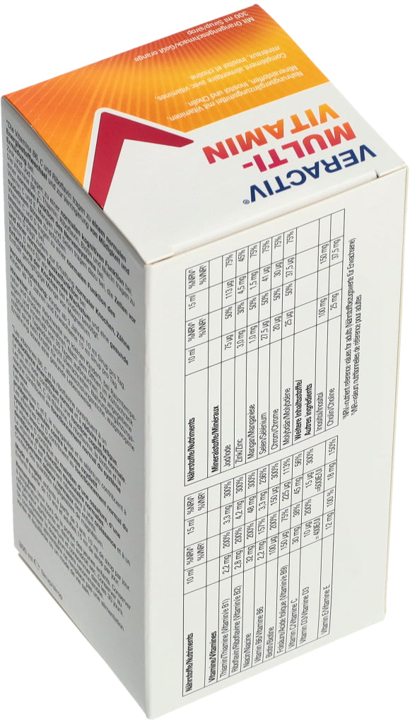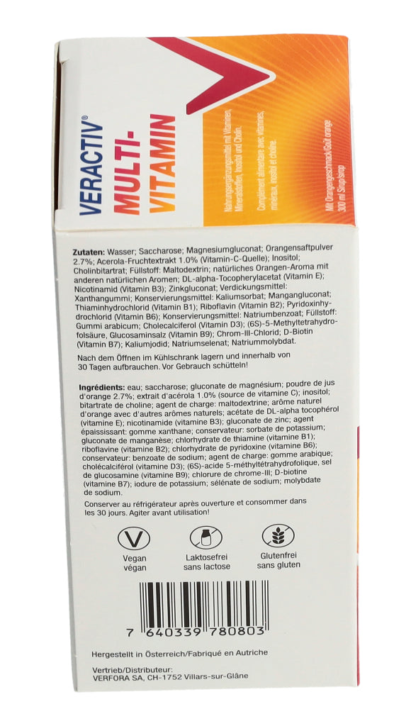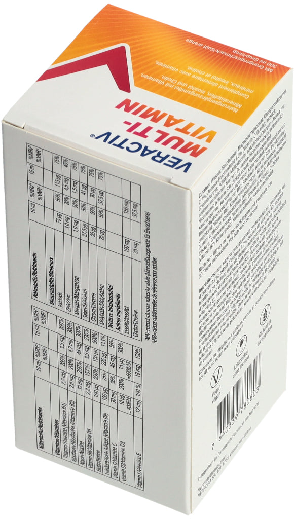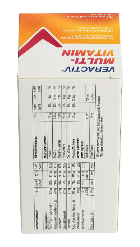 Wasser; Saccharose; Magnesiumgluconat; Orangenfruchtsaftpulver; Acerolafruchtextrakt; Inosit; Cholinbitartrat; Maltodextrin; Zinkgluconat; DL-alpha Tocopherylacetat; Aroma; Nicotinamid; Calcium-D-pantothenat; Mangangluconat; Pyridoxal-5-phosphat; Thiaminhydrochlorid; Riboflavin; Pteroylmonoglutaminsäure; Chrom(lll)-Chlorid; D-Biotin; Kaliumiodid; Natriumselenat; Natriummolybdat; Cyanocobalamin; Cholecalciferol; Verdickungsmittel: Xanthan; Konservierungsstoffe: Kaliumsorbat, Natriumbenzonat..