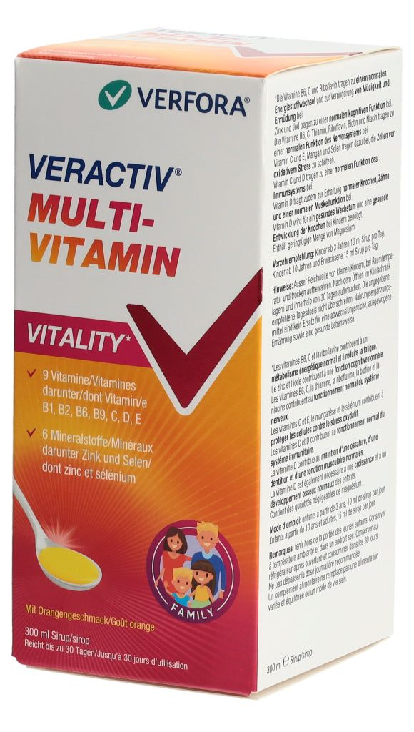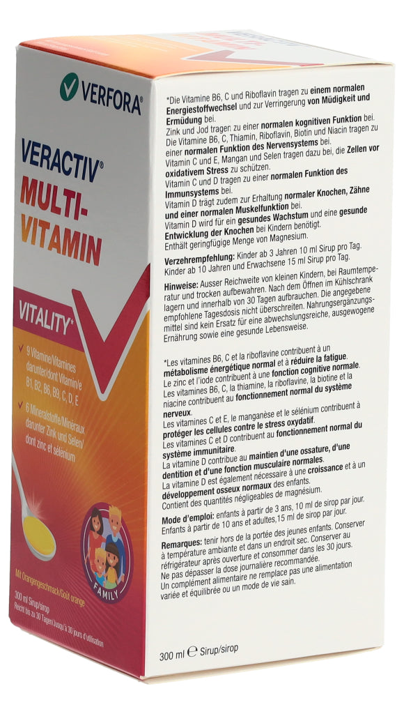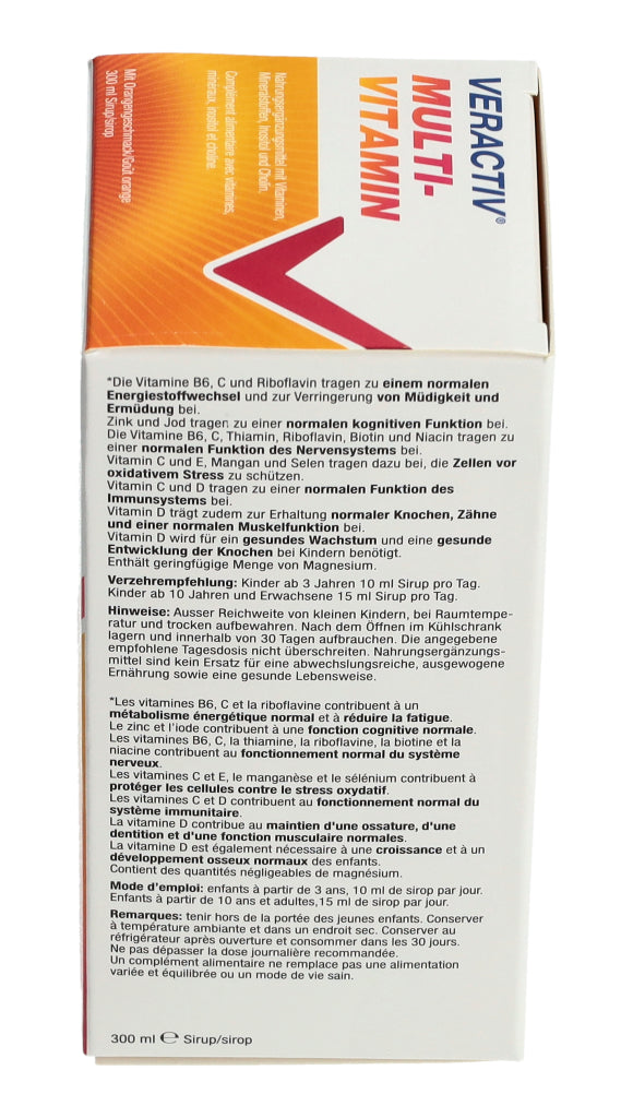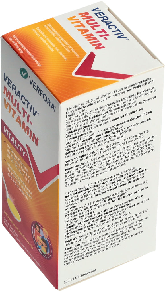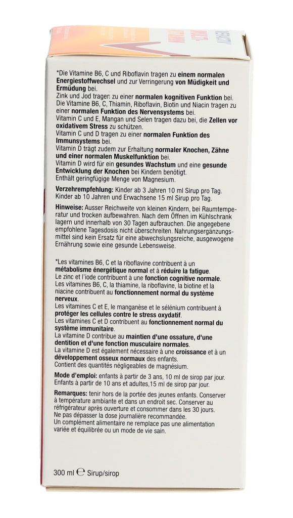 Die Vitamine C, B6, B12, Riboflavin und Pantothensäure tragen zu einem normalen Energiestoffwechsel und zur Verringerung von Müdigkeit und Ermüdung bei.