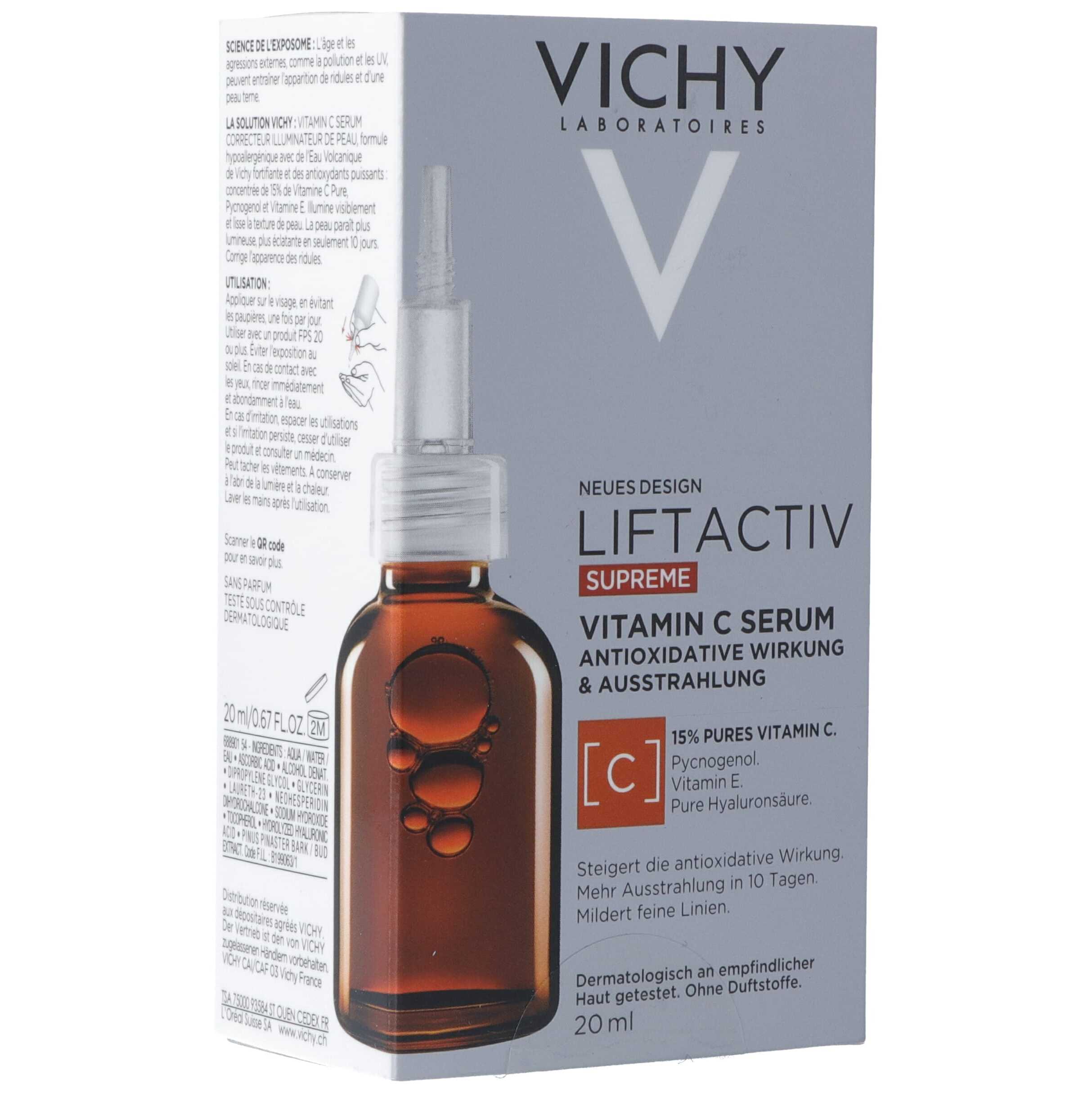 Vichy Liftactiv Supreme Vitamin C15 Serum steigert die antioxidative Wirkung und sorgt für mehr Ausstrahlung in 10 Tagen, mildert Linien und Falten. Hautalterung und äussere Einflüsse wie Umweltverschmutzung und UV-Strahlen können das Auftreten von feinen Linien und einem fahlen Teint führen. Die Formel mit stärkendem Vichy-Vulkanwasser und Antioxidantien: Konzentriertes Vitamin C, Pycnogenol, und Vitamin E. Die Haut strahlt und feine Linien werden gemildert, die antioxidative Wirkung wird verstärkt.