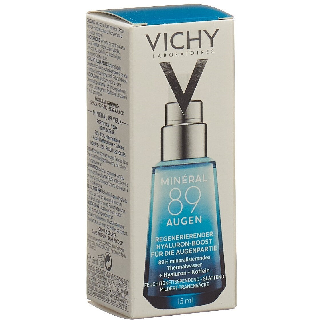 Die Vichy Mineral89 Augenpflege sorgt täglich für einen strahlenden Blick. Die Augenpflege enthält die hochkonzentrierte Kraft von 89% Thermalwasser, kombiniert mit Hyaluronsäure natürlichen Ursprungs und reinem Koffein. Der einzigartige Frische-Boost stärkt zudem die Abwehrfunktionen der Haut gegenüber inneren und äusseren Einflüssen. Dazu gehören Stress, Müdigkeit, Rauchen, Kälte und Umweltverschmutzung.