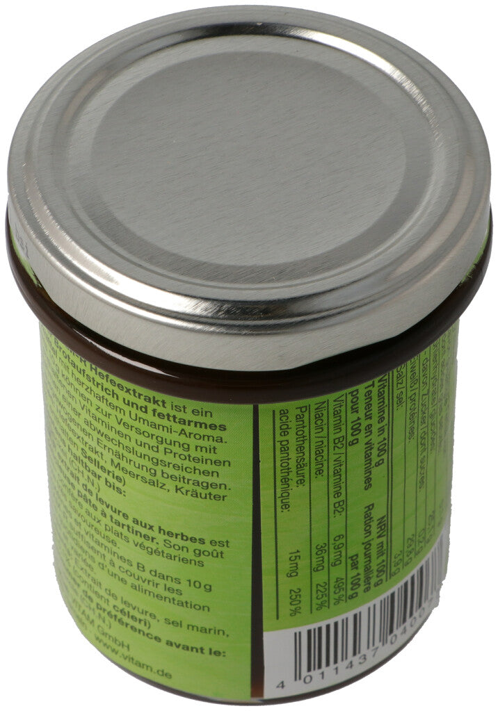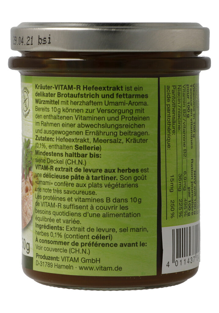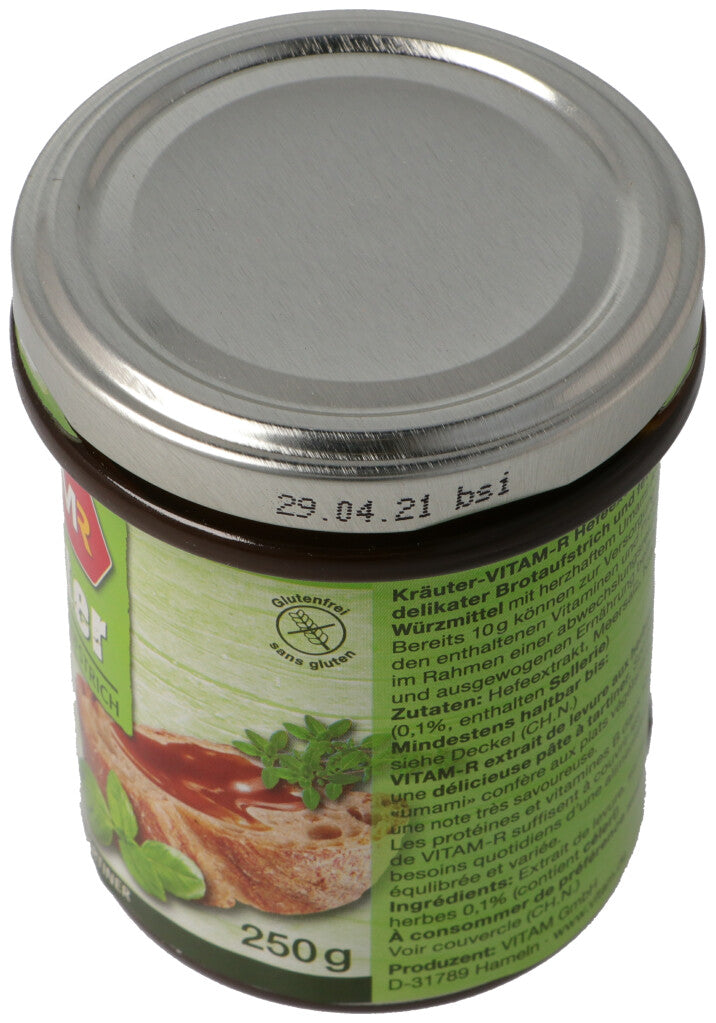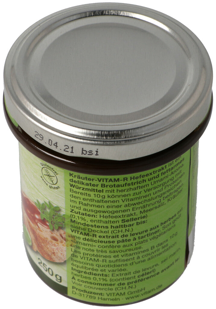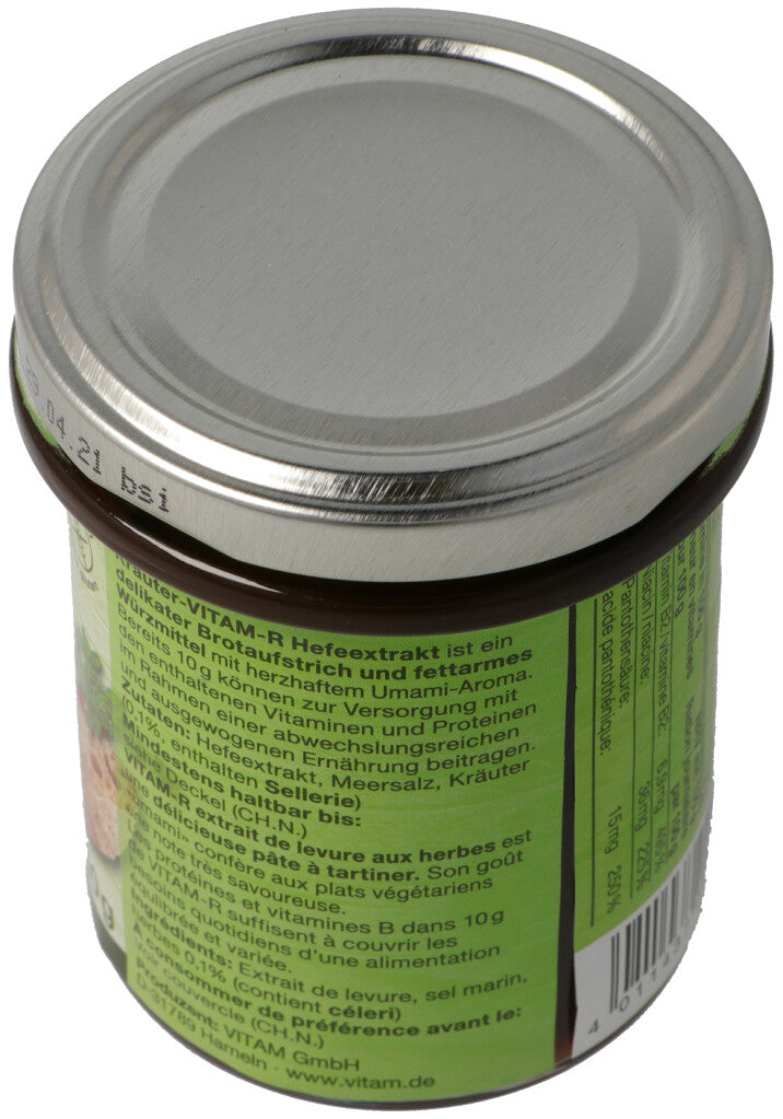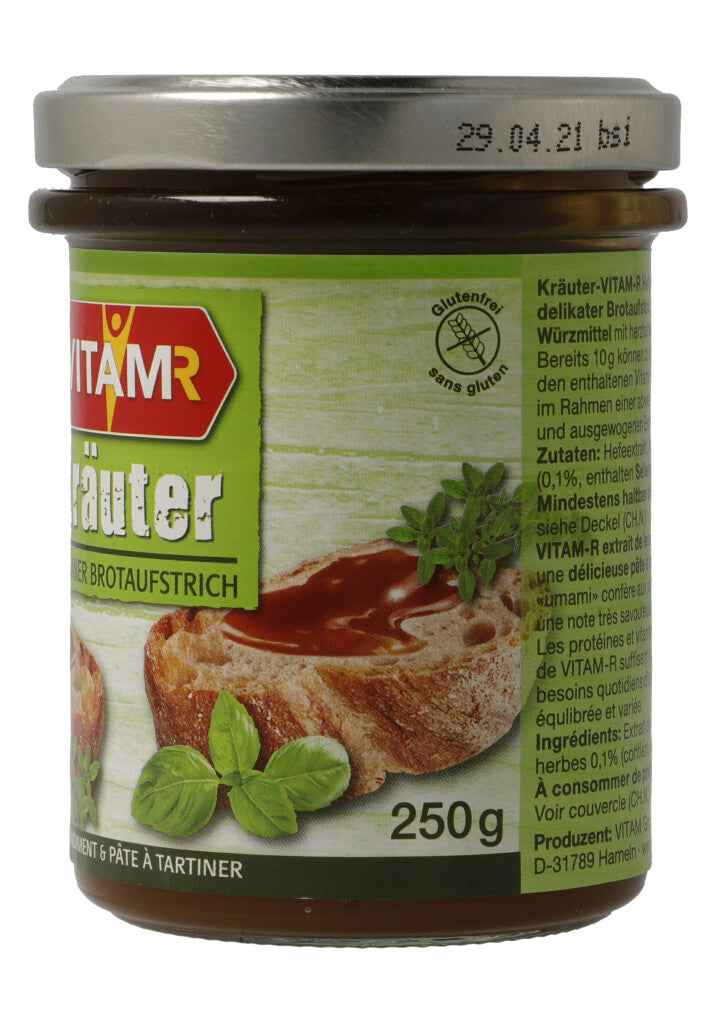 Kräuter- VITAM-R Hefeextrakt ist ein delikater Brotaufstrich und fettarmes Würzmittel mit herzhaftem Umami-Aroma. Vegan.