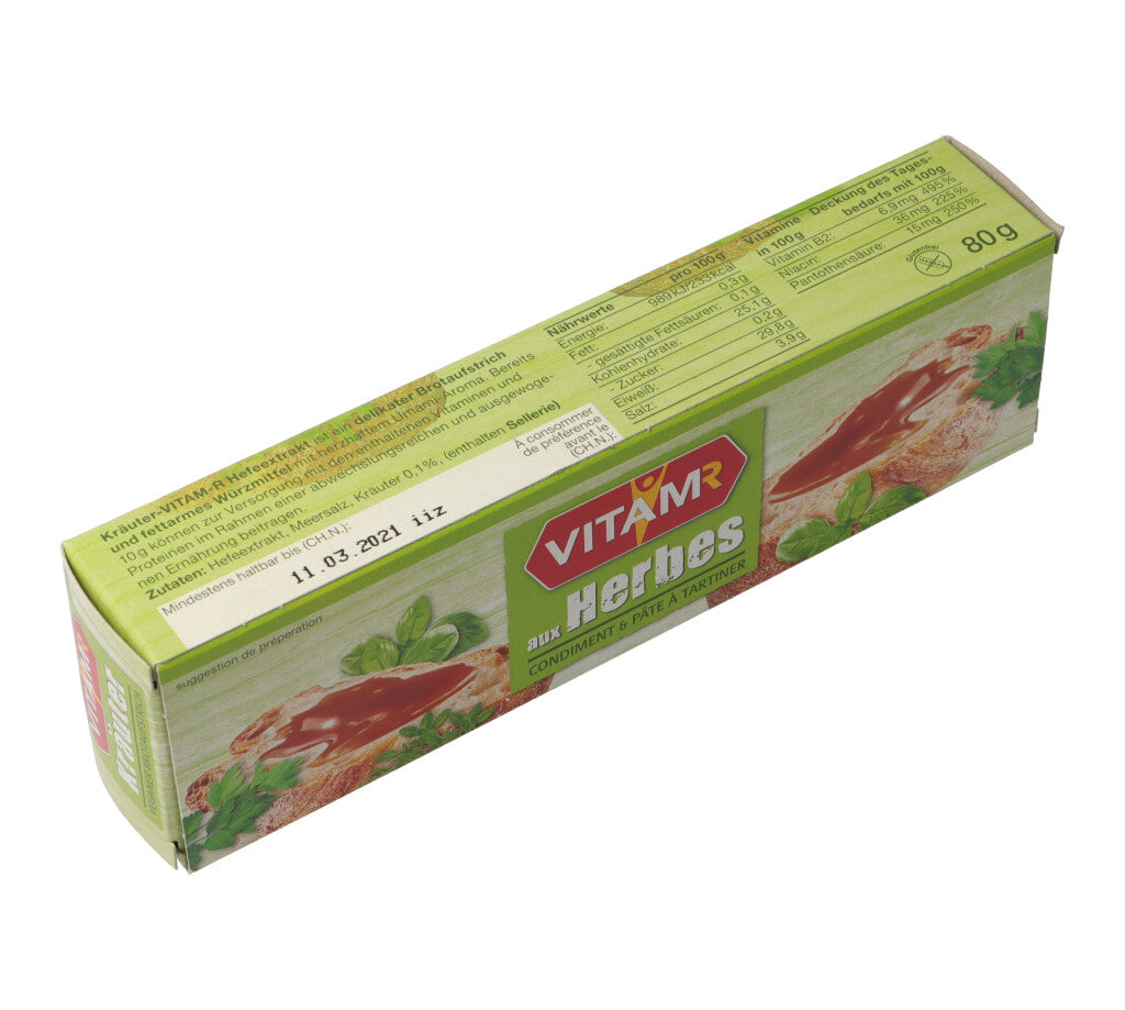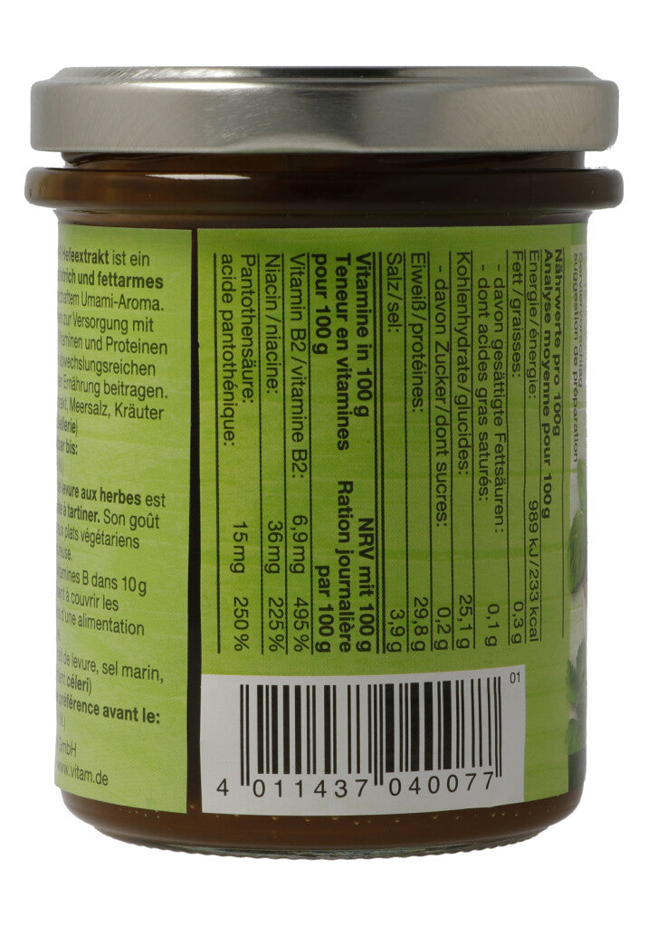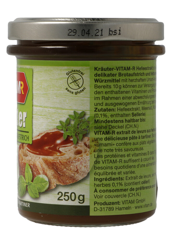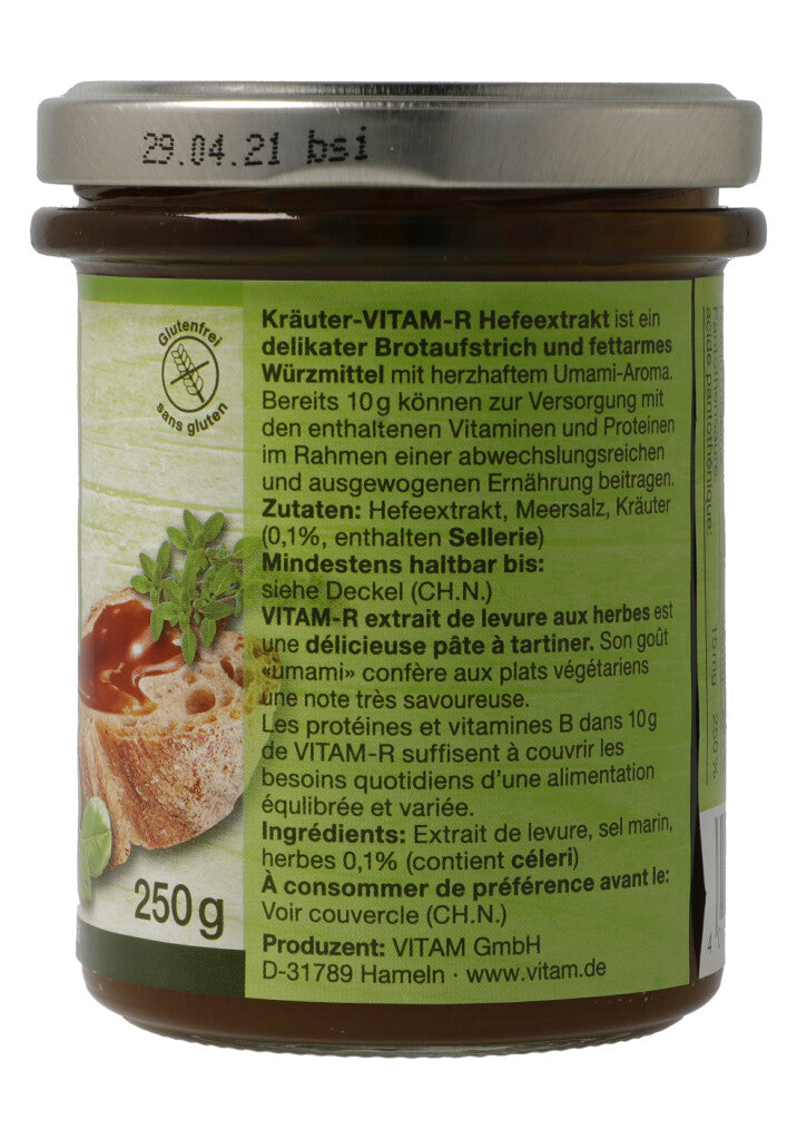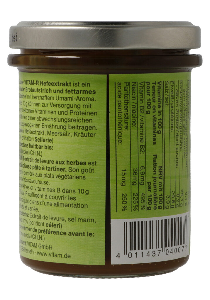 Kräuter- VITAM-R Hefeextrakt ist ein delikater Brotaufstrich und fettarmes Würzmittel mit herzhaftem Umami-Aroma. Vegan.