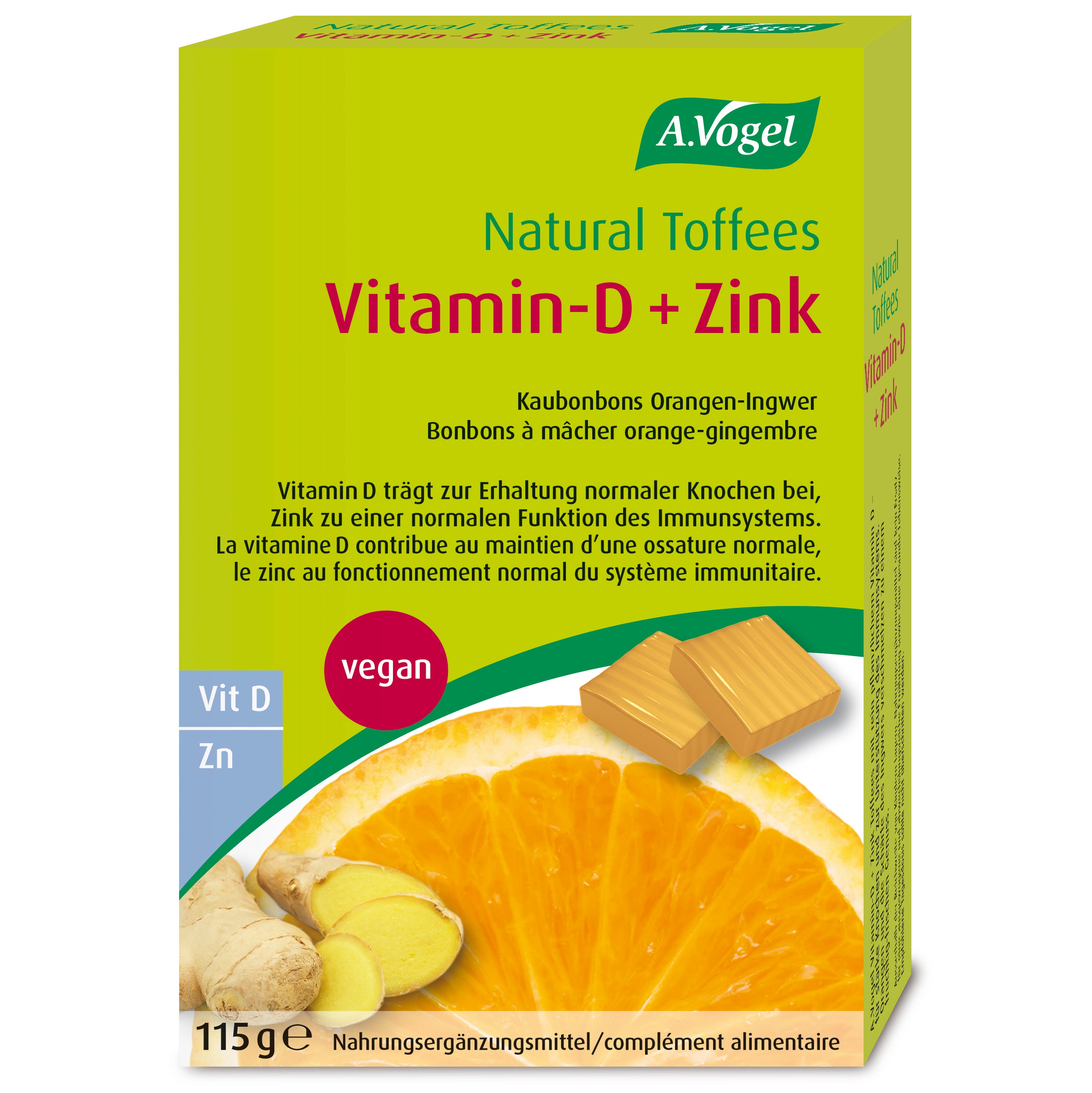 A.Vogel Vitamin D + Zink Toffees mit pflanzlichem Vitamin D. Vitamin D trägt zur Erhaltung normaler Knochen bei, Zink zu einer normalen Funktion des Immunsystems. Orangen und die Schärfe des Ingwers verschmelzen zu einem fruchtig-frischen Genuss.