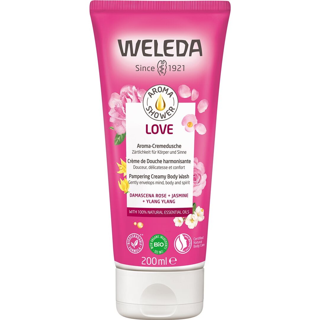 Weleda Aromashower Love verwöhnt die Sinne mit einem sanft blumigen Duft von Damaszener Rose, Jasmin und Ylang-Ylang.