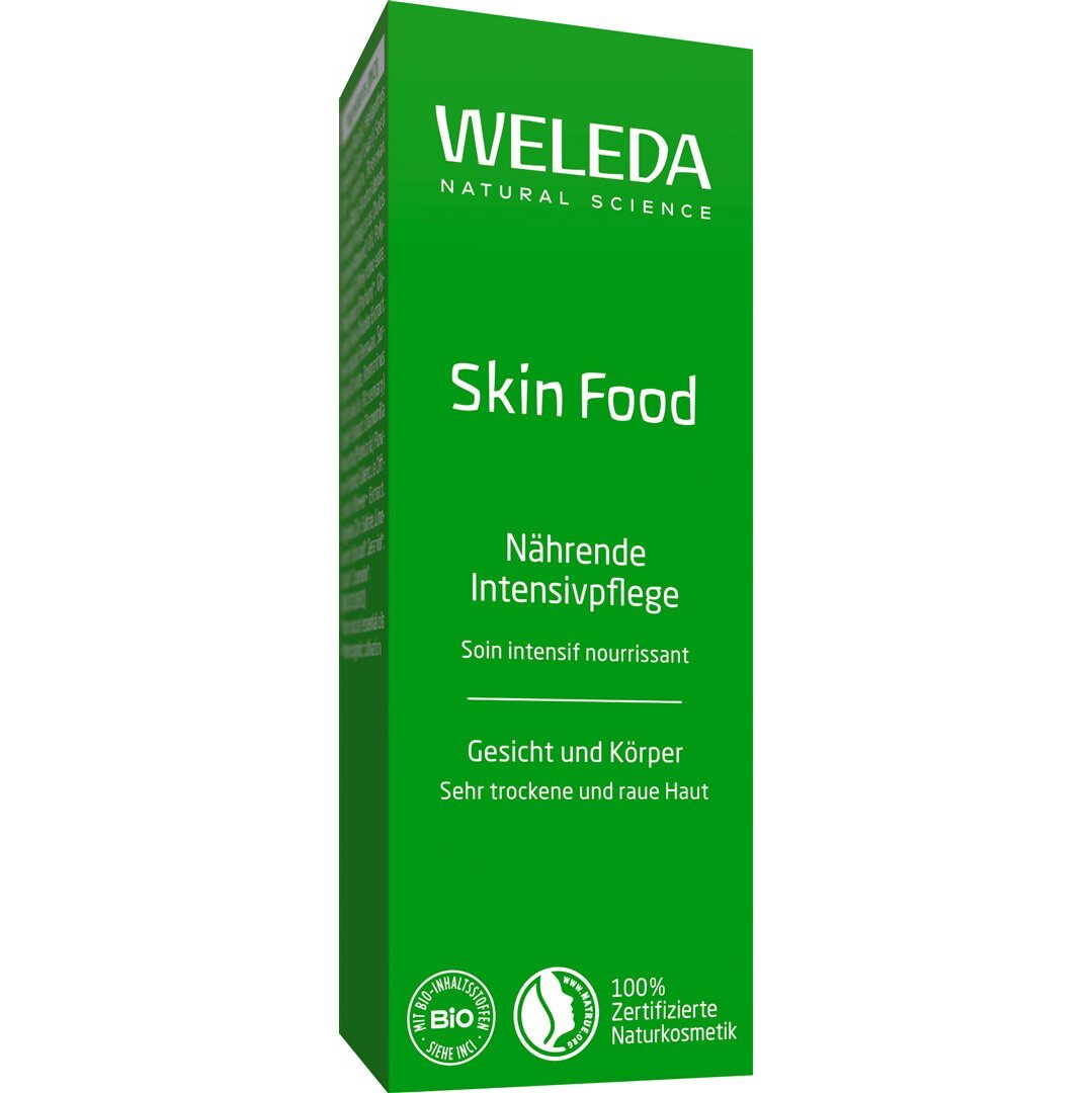 Weleda Skinfood Hautcreme ist eine intensive dezent duftende Basispflege für trockene Haut und hilft raue Stellen an den Händen, Füssen und Ellenbogen zu regenerieren.